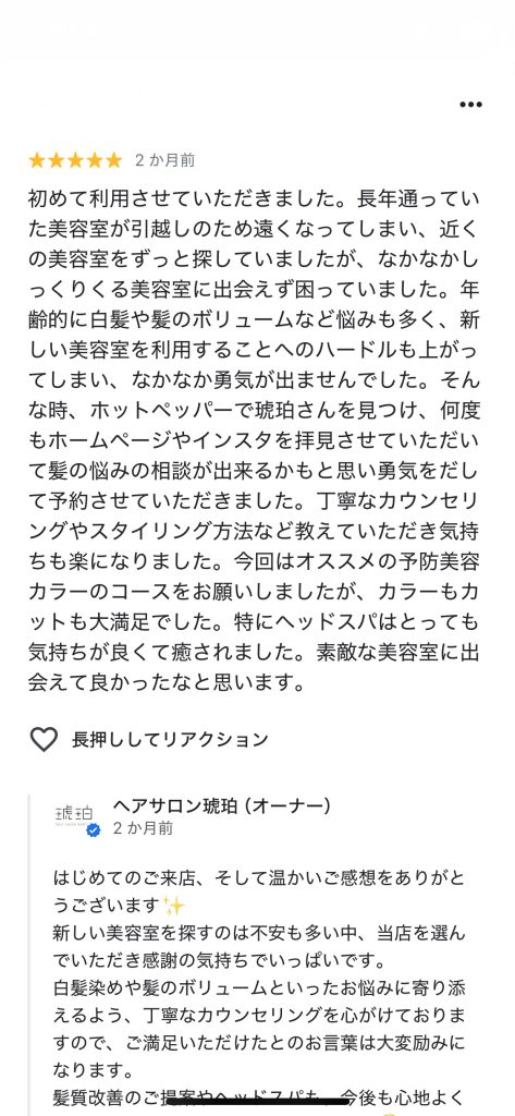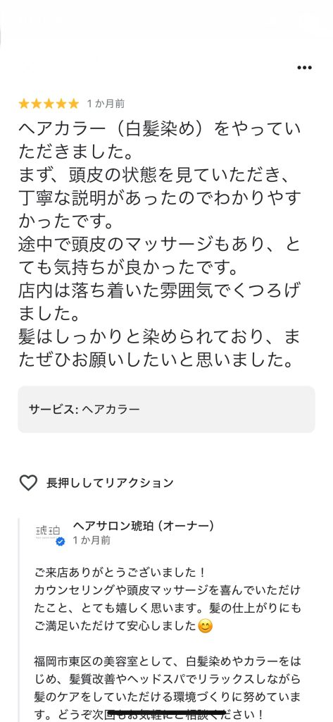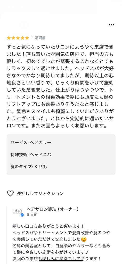 【予防美容カラーと極上ヘッドスパ】「毎月のことだからこだわりたい!」そんなあなたのために極上の時間を提供する美容室。一度体験すると次回が楽しみになるヘッドスパで未来の髪を育てましょう。低臭低刺激の白髪染めは大人女性に大人気!マンツーマンで安心してずっと通えるあなたの専属美容室!詳細を知りたい方はクリック!